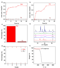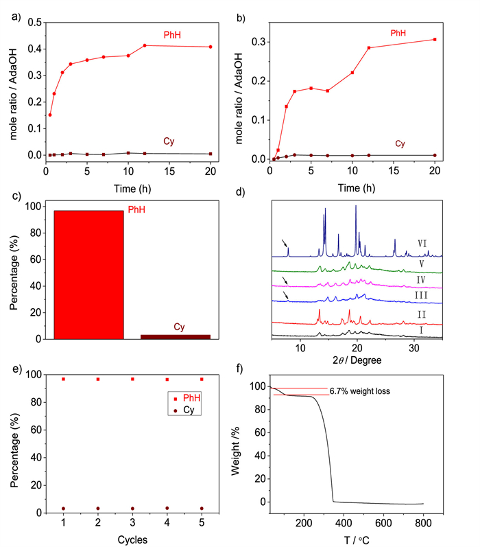 | Fig. 2. (a) Time-dependent solid-vapor sorption plots of activated AdaOH for single-component vapors. (b) Time-dependent solid–vapor sorption plot of activated AdaOH for PhH and Cy equal volume mixtures vapor. (c) Relative uptakes of PhH and Cy adsorbed by activated AdaOH that adsorbed PhH/Cy mixtures for 12 h as measured by gas chromatography. (d) PXRD patterns of AdaOH: (Ⅰ) activated AdaOH; (Ⅱ) activated AdaOH adsorption of Cy vapour for 12 h; (Ⅲ) activated AdaOH adsorption of PhH vapour for 12 h; (Ⅳ) activated AdaOH adsorption of PhH/Cy mixtures vapour for 12 h; (Ⅴ) activated AdaOH after adsorption of PhH/Cy mixtures vapour for 12 h and then heating at 150 ℃ for 2 h; (Ⅵ) simulated from single-crystal structure of PhH@(AdaOH)2. (e) Relative uptakes of PhH and Cy by activated AdaOH that adsorbed PhH/Cy mixtures for 12 h after five recycles. (f) Thermogravimetric analysis of activated AdaOH after sorption of PhH/Cy mixtures vapor for 12 h. | |