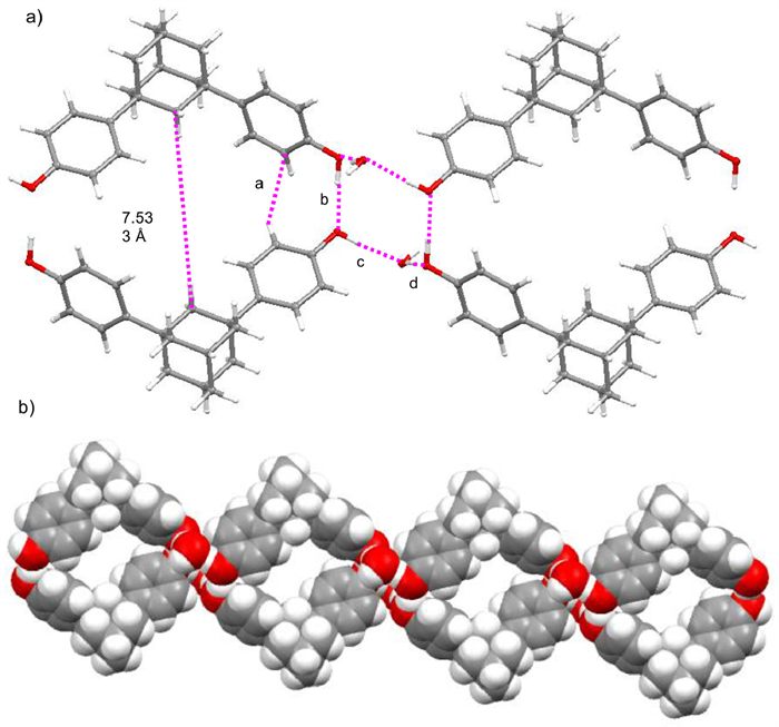 To reveal the mechanism of high adsorption capacity for PhH of activated AdaOH, single crystals of AdaOH, PhH@(AdaOH)2 and toluene@(AdaOH)2 were obtained by slow diffusion of the solution of AdaOH in CH3CN, CH3CN/PhH (v:v = 1:1) and CH3CN/toluene (v:v = 1:1), respectively. However, the single crystals of o-xylene@(AdaOH)2, m-xylene@(AdaOH)2 and p-xylene@(AdaOH)2 cannot be obtained under the same conditions and only obtained the crystals of AdaOH. This may be due to the weak adsorption capacity for xylene of AdaOH, which was consistent with the results before. Similar to the crystal structure of AdaOH in chloroform reported by Tominaga’s group [47], the crystal structure of AdaOH grown in CH3CN can also associated into infinite 1D polymers via hydrogen bonds between the hydroxyl groups of phenol parts and water molecules. As shown in Fig. 4a, cyclic structures with sizes of 7.533 Å (measured from the center carbon atom of the adamantane to the center carbon atom of the adamantane) were formed through two molecules of AdaOH by intermolecular hydrogen bonds between the hydroxyl groups of the phenol moieties and water molecules with the distance of 1.826 Å (b), 1.838 Å (c) and 1.853 Å (d), respectively. Moreover, CH···π intermolecular interactions between the phenol moieties with the distance of 2.799 Å (a) were also observed.