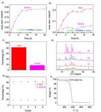 | Fig. 3. (a) Time-dependent solid-vapor sorption plots of activated AdaOH for single-component vapors. (b) Time-dependent solid–vapor sorption plot of activated AdaOH for BTX mixtures vapor. (c) Relative uptakes of PhH and toluene adsorbed by activated AdaOH that adsorbed BTX mixtures for 12 h as measured by gas chromatography. (d) PXRD patterns of AdaOH: (Ⅰ) activated AdaOH adsorption of PhH vapor for 12 h; (Ⅱ) activated AdaOH adsorption of toluene vapour for 12 h; (Ⅲ) activated AdaOH adsorption of BTX vapour for 12 h; (Ⅳ) simulated from single-crystal structure of toluene@(AdaOH)2. (e) Relative uptakes of PhH and toluene by activated AdaOH that adsorbed BTX mixtures for 12 h after five recycles. (f) Thermogravimetric analysis of activated AdaOH after sorption of BTX mixture vapor for 12 h. | |