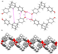 We reasoned that the assembly of the AdaOH with cavities might be useful for capturing guest molecules such as PhH and toluene, and the single crystal structures of PhH@(AdaOH)2 and toluene@(AdaOH)2 were thus grown. As expected, in the crystal structure of PhH@(AdaOH)2, PhH molecule was located inside the cavity of the formed cyclic structure by AdaOH to formation of 1:2 complexes. To our surprise, there are no noncovalent interactions between the PhH and AdaOH. The high adsorption capacity of activated AdaOH for PhH may be due to the size matching between the PhH molecule and the formed cyclic structure by AdaOH (Fig. 5a). Similar situation to the structure of PhH@(AdaOH)2, toluene molecule was also located inside the cavity of the formed cyclic structure by AdaOH to formation of 1:2 complexes (Fig. 5b). Additionally, CH···π intermolecular interactions between toluene and the phenol moieties of AdaOH with the distance of 2.842 Å (e) and 2.879 Å (f) were observed. It was also found that there were CH···π intermolecular interactions between toluene and the adamantane moieties of AdaOH with the distance of 2.887 Å (g). Because of these multi noncovalent interactions, the toluene molecules were firmly embedded in the cavity of the formed cyclic structure by AdaOH. From the a-axis direction of PhH@(AdaOH)2 and toluene@(AdaOH)2 complex packing structure, a large number of PhH and toluene molecules are captured in the crystal structure.