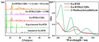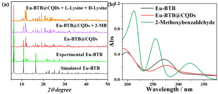 | Fig. 1. (a) PXRD patterns of Eu-BTB and Eu-BTB@CQDs in different conditions; (b) UV–vis spectra of Eu-BTB, Eu-BTB@CQDs and 2-methoxybenzaldehyde in the water solutions. | |