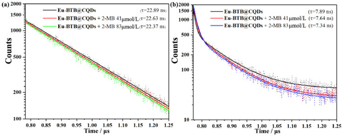 | Fig. 10. (a) The luminescent lifetime of the Eu-BTB@CQDs with the addition of 2-MB in different concentration (0–83 µmol/L) at 364 nm which excited at 295 nm. (b) Luminescent lifetime of the Eu-BTB@CQDs with the addition of 2-MB in different concentration (0–83 µmol/L) at 617 nm, which excited at 360 nm. | |