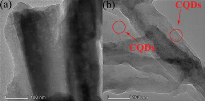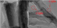 | Fig. 2. TEM images of (a) Eu-BTB and (b) Eu-BTB@CQDs. | |