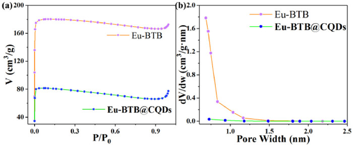 | Fig. 3. (a) Nitrogen gas adsorption isotherm at 77 K for Eu-BTB and Eu-BTB@CQDs. (b) Pore distribution for Eu-BTB and Eu-BTB@CQDs. | |