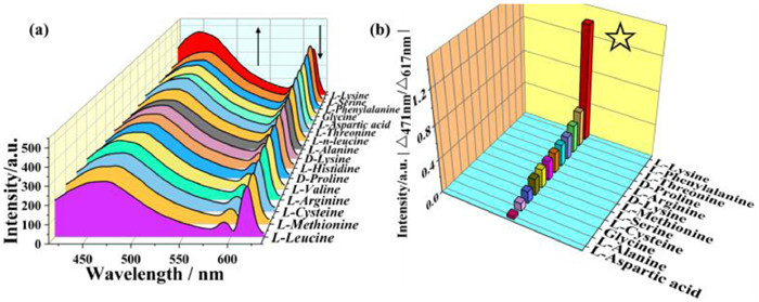 | Fig. 4. (a) Luminescent emission spectra of Eu-BTB@CQDs suspension (0.1 g/L, 1 mL) by the addition of different amino acids solutions (30 µmol/L) when excited at 360 nm. (b) The ratio of luminescent intensities (△467 nm/△617 nm) when different amino acids solutions (30 µmol/L) were added into Eu-BTB@CQDs suspensions (0.1 g/L), respectively (excited position is 360 nm). | |