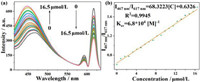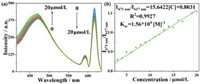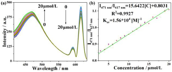 | Fig. 5. (a) Luminescent spectra of the Eu-BTB@CQDs (0.1 g/L) with the addition of L-lysine in different concentrations (0–20 µmol/L) when excited at 360 nm, the slit is 5 nm. (b) The linear relationship between luminescent intensity ratio of Eu-BTB@CQDs and the concentration of L-lysine. | |