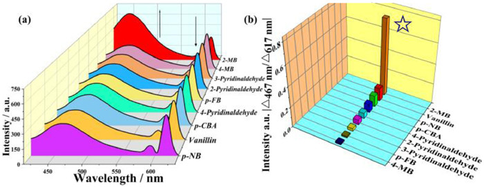 | Fig. 6. (a) Luminescent emission spectra of Eu-BTB@CQDs suspension (0.1 g/L, 1 mL) by the addition of different aldehydes solutions (24.6 µmol/L) when excited at 360 nm. (b) The ratio of luminescent intensity difference (△467nm/△617 nm) when different aldehydes solutions (24.6 µmol/L) are added into Eu-BTB@CQDs suspensions (0.1 g/L), respectively (excited position is 360 nm). | |