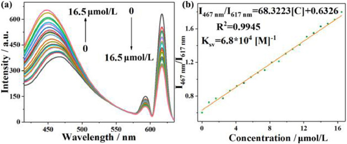 | Fig. 7. (a) Luminescent spectra of the Eu-BTB@CQDs (0.1 g/L) with the addition of 2-methoxybenzaldehyde in different concentration (0–16.5 µmol/L), the excited position is 360 nm, the slit is 5 nm. (b) The linear relationship between luminescent intensity ratio of Eu-BTB@CQDs and the concentration of 2-methoxybenzaldehyde. | |