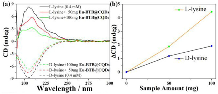 | Fig. 8. (a) The CD spectra of L/D-lysine solutions (0.4 mmol/L) with different amounts of Eu-BTB@CQDs added. (b) The ΔCD values of L/D-lysine solutions. | |