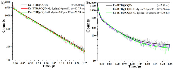 | Fig. 9. (a) Luminescent lifetime of the Eu-BTB@CQDs with the addition of L-lysine in different concentration (0–100 µmol/L) at 364 nm, which excited at 295 nm. (b) Luminescent lifetime of the Eu-BTB@CQDs band located at 617 nm with the addition of L-lysine in different concentration (0–100 µmol/L) which excited at 360 nm. | |