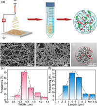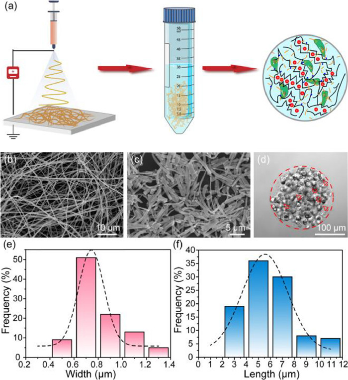 | Fig. 1. The synthesis and characterization of PLA nanofibers. (a) Schematic diagram for the fabrication of PLA nanofibers and PLA nanofiber reinforced alginate microgels. SEM images of (b) PLA nanofibers and (c) aminolyzed micron-length PLA nanofibers. Scale bars represent 10 µm and 5 µm, respectively. (d) PLA nanofiber reinforced alginate microgels for cell encapsulation, red arrows point out the PLA nanofibers. Scale bar: 100 µm. (e) Width and (f) length distribution of aminolyzed micro-short PLA nanofibers. Fitting performed assuming normal distribution, mean values ± SD: d = 0.8062 ± 0.1966 µm, L = 5.9048 ± 2.1419 µm, both n = 100. | |
