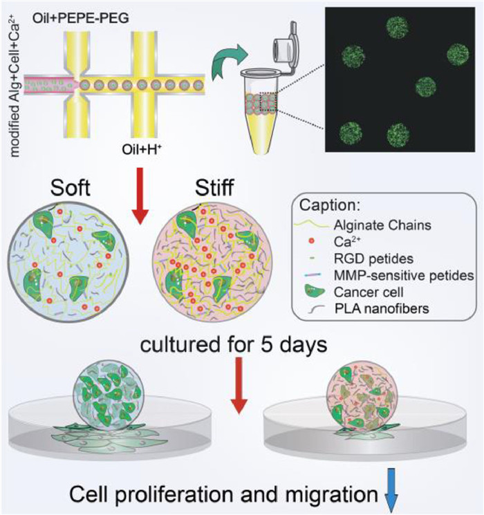 Herein, we present an innovative strategy to reinforce 3D microgel constructs by formulating composite hydrogel composed of modified alginate and different amount of micron-scale polylactide (PLA) nanofibers for solid carcinoma engineering (Scheme 1). The modified alginate with PVGLIG (proline-valine-glycine-leucine-isoleucine-glycine) and RGD (arginine-glycine-aspartate) peptides provided corresponding sites for cell migration and adhesion. By adding microscale PLA nanofibers uniformly by ultrasound, the composite microgels with increased stiffness showed the similar pore size, proving that we have created a 3D mechanical matrix platform with univariate variables. Following this strategy, solid breast tumors within the pathological breast stiffness range (2–20 kPa) were successfully simulated by using different composite gel ratios and two breast cancer cells with different invasive abilities, epithelial phenotype breast cancer cells MCF-7 and more aggressive mesenchymal SUM-159 [23]. Obviously, high proliferation and invasion ability of both cell types in soft matrix were observed. Furthermore, RT-qPCR analysis revealed the underlying changes at the genetic level. In this study, the proposed 3D microgel with homogeneous microstructure and adjustable stiffness effectively simulates the mechanical microenvironment of solid breast tumors, and demonstrates the advantages in-vitro simulation and tissue engineering.