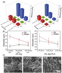 | Fig. 2. Performance characterizations of microgels. (a) Modulus of 2.0% Alginate with different Ca2+ concentration and with PLA nanofibers. N = 3, E'= elastic component, E'' = viscous component, G* = Young's modulus. (b) Swelling performance of different formulations. The microgels generated in oil and soaked in water for 24 h for diameter recording. (c) SEM images of three composite hydrogel formulations, scale bar: 100 µm. | |