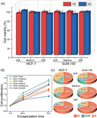 | Fig. 3. State of MCF-7 and SUM-159 cells within the modified microgels with tunable stiffness. (a) Counting and quantitative viability analysis of encapsulated cell in microgels, n = 50. (b) Proliferation curves of cells encapsulated in heterogeneous environments. N = 3. (c) Analysis of cell cycle in 3D conditions for 48 h by flow cytometry. N = 3. | |