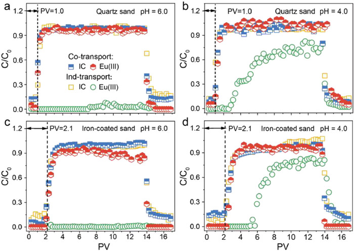 | Fig. 1. Effect of pH on co-transport of Eu(Ⅲ) and IC in (a, b) saturated quartz sand and (c, d) iron-coated sand columns. CIC = 50 mg/L, CEu(Ⅲ) = 5 µmol/L, CNaCl = 1 mmol/L, T = 25 ℃. | |
