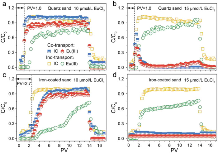| Fig. 2. Effect of Eu(Ⅲ) concentration on co-transport of Eu(Ⅲ) and IC in (a, b) saturated quartz sand and (c, d) iron-coated sand columns. CNaCl = 1 mmol/L, CIC = 50 mg/L, pH = 5.0, T = 25 ℃. | |