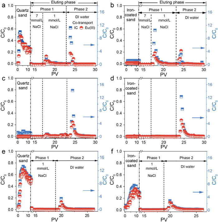| Fig. 3. Retention and release of Eu(Ⅲ) and IC in (a, c, e) saturated quartz sand and (b, d, f) iron-coated sand columns. (a), (b), (c), (d), (e) and (f) are Exp. 1, Exp. 2, Exp. 3, Exp. 4, Exp. 5, and Exp. 6 (detailed conditions are shown in Table 1), respectively, Phase 1 was the elution phase with NaCl, Phase 2 was the elution phase with DI water, the transport phase corresponds to the left ordinate, and the eluting phase corresponds to the right ordinate. (a, b) CEu(Ⅲ) = 5 µmol/L, CNaCl = 7 mmol/L; (c, d) CEu(Ⅲ) = 10 µmol/L, CNaCl = 7 mmol/L; (e, f) CEu(Ⅲ) = 13 µmol/L, CNaCl = 1 mmol/L. CIC = 50 mg/L, pH = 5.0, T = 25 ℃. | |