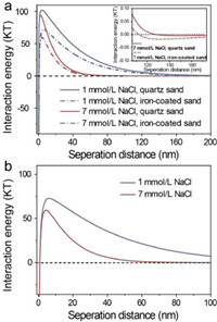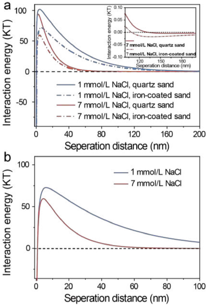 | Fig. 4. Calculated DLVO interaction energy of colloidal particles and media as a function of separation distance at different NaCl concentrations. (a) IC-media, (b) IC-IC. | |