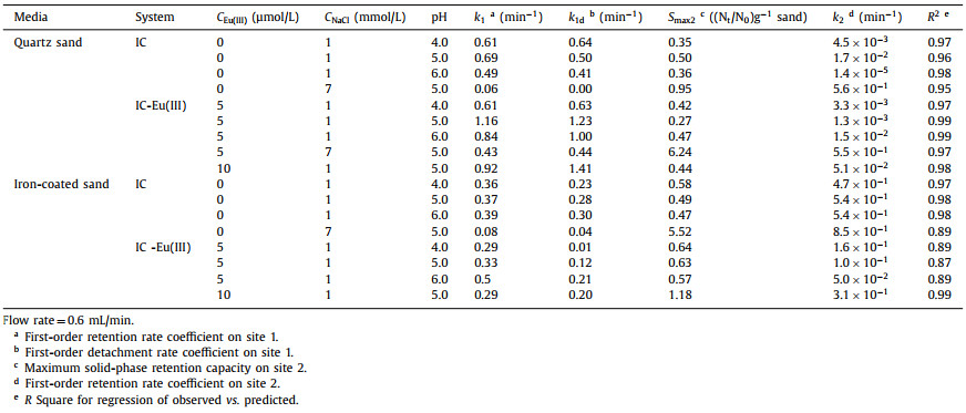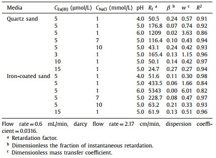 Table 3 The transport parameters of Eu(Ⅲ) fitted with non-equilibrium two-site model using CXTFIT. |