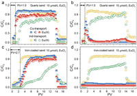 The breakthrough curves of IC and Eu(Ⅲ) at various pH values through the quartz sand and iron-coated sand column were plotted in Fig. 1. The Eu(Ⅲ) transport was significantly facilitated by IC within the concerned pH range compared with the individual transport of Eu(Ⅲ). The presence of mobile IC greatly promoted the transport ability of Eu(Ⅲ), and thus increased its leakage risk to biosphere. Due to the prominent Eu(Ⅲ) sorption ability and transport ability of IC, Eu(Ⅲ) preferred attaching to mobile IC and transporting simultaneously with IC as a passenger (Fig. S3 in Supporting information). According to the column parameters, there is no difference in the porosity and pore volume (PV) of the iron sand column and the Q-column (Table S1), and thus the size exclusion effect caused by the two media should be the same. However, the significant retardation occurred in the iron-coated sand column even for the dispersed colloids at pH 6, the breakthrough PV of Eu(Ⅲ)-IC hybrid were 1.0 and 2.1 in the quartz sand and iron-coated sand, respectively (Figs. 1a and c). The effluent mass recovery rate (Meff) of Eu(Ⅲ) in the presence of colloids were 100% and 87% for the quartz sand and iron-coated sand systems at pH 4 (Table S3 in Supporting information), which implied not only that the Eu(Ⅲ) transport was driven by colloids, but also the electrostatic attraction inhibited the transport ofcolloid-carried Eu(Ⅲ). Due to the cladding of iron oxides, the apparent zeta potential of iron-coated sand was less negative compared with that of quartz sand (Fig. S4 in Supporting information), which was responsible for the increased IC retention in the iron-coated sand system. The positively charged iron oxide surface tended to bind with the negatively charged surface of illite colloid particles and led to the strong retention of IC-Eu(Ⅲ) hybrid, which was consistent with the observation that positively charged packing media showed higher affinity for negatively charged biochar nanoparticles [9,43].