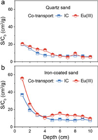 In addition, the discernible retardation was observed during the individual transport of Eu(Ⅲ) and IC in the iron-coated sand. According to the fitting parameters of two-sites kinetic attachment/detachment model and two-sites nonequilibrium model, the maximum solid-phase retention capacity on site 2 (Smax2) of colloids (Table 2) and the retardation factor (Rf) of Eu(Ⅲ) (Table 3) in iron-coated sand were accordingly larger than that in quartz sand, which confirmed the enhanced retention of IC and Eu(Ⅲ) caused by the strong interaction of the iron-coated sand with IC and Eu(Ⅲ). Note that the Eu(Ⅲ) alone hardly passed through the column at pH 6; the Rf value of Eu(Ⅲ) greatly increased with increasing pH. The increasing effect of Rf was stronger in the iron-coated sand column. This was consistent with the observations from the batch sorption experiments, showing that the increased adsorption capacity (Cs) of Eu(Ⅲ) with increasing pH on iron-coated sand was notably higher than that on quartz sand (Fig. S3a) [44]. The parameter β representing the fraction of instantaneous retardation decreased with the increase of pH and was smaller in iron-coated sand system than in quartz sand system (Table 3), suggesting that the non-equilibrium adsorption of Eu(Ⅲ) dominated at high pH and in iron-coated sand media [45]. Hence, the inhibition of the radionuclides transport by metal oxides such as iron oxides was not negligible due to the strong affinity of metal oxides for radionuclides. Despite such strong affinity of Eu(Ⅲ) to host packing media, the transport behaviors of Eu(Ⅲ) during the co-transport process were significantly governed by the behavior of IC. The adsorption capacity of Eu(Ⅲ) on IC was largely higher than that on quartz sand, which even differed in four orders of magnitude (Fig. S3). The strong interaction of IC and Eu(Ⅲ) resulted in quite stable Eu(Ⅲ)-colloid particles, which are able to survive under the competition from host media during the co-transport process.