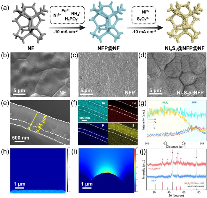 | Fig. 1. (a) Schematic illustration of the synthesis route for Ni3S2@NFP electrocatalyst. NFP stands for amorphous nickel-iron-based phosphide and NP stands for nickel-based phosphide. SEM images of (b) NF, (c) NFP and (d) Ni3S2@NFP. (e) Cross-section SEM image, (f) EDS mapping and (g) elemental line scanning of Ni3S2@NFP. Simulation results of electric field intensity for the electrodes consisting of (h) compact (representing NFP and Ni3S2) and (i) broccoli-like (representing Ni3S2@NFP) nanoparticles. (j) XRD patterns of NFP and Ni3S2@NFP. | |
