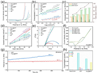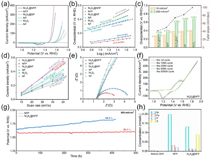| Fig. 2. (a) The LSV curves of different electrodes in 1.0 mol/L KOH with 95% iR-compensation and (b) the corresponding Tafel slopes. (c) The overpotentials at 10 and 500 mA/cm2, along with the Tafel slopes of the catalysts in (a). (d) Double-layer capacitances and (e) Nyquist plots of the catalysts measured at 1.47 V. (f) The accelerated duration test of Ni3S2@NFP with 50 mV/s scan rate. (g) Chronopotentiometry curves of Ni3S2@NFP and NFP at 500 mA/cm2. (h) Inductively coupled plasma-optical emission spectrometry (ICP-OES) results of the electrolyte after OER chronopotentiometry test. The detailed data are listed in Table S3 (Supporting information). | |