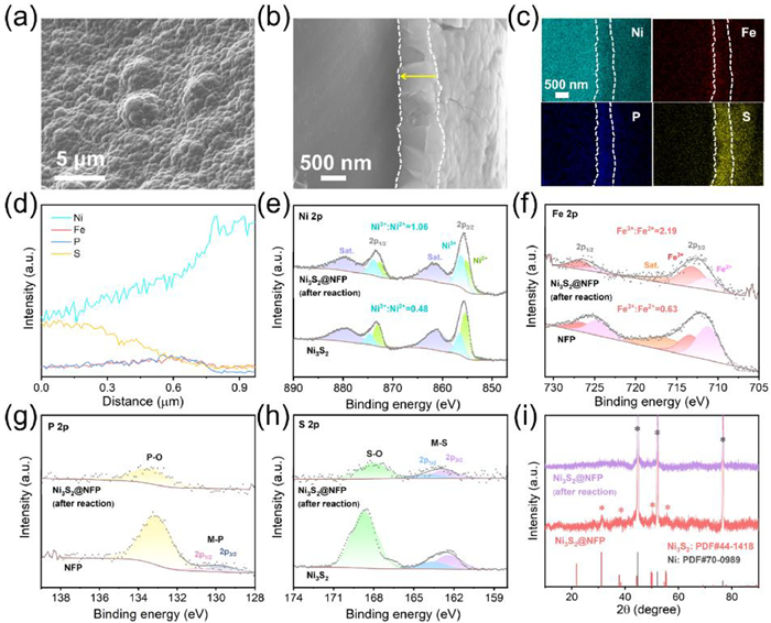 | Fig. 3. (a) The top-view and (b) cross-section SEM images of Ni3S2@NFP electrode after OER test. (c) EDS mapping and (d) elemental line scanning of the Ni3S2@NFP fracture surface. High resolution XPS spectra of (e) Ni 2p, (f) Fe 2p, (g) P 2p, (h) S 2p for Ni3S2@NFP, NFP and Ni3S2. (i) XRD patterns of Ni3S2@NFP on Ni foam before and after electrolysis. | |