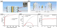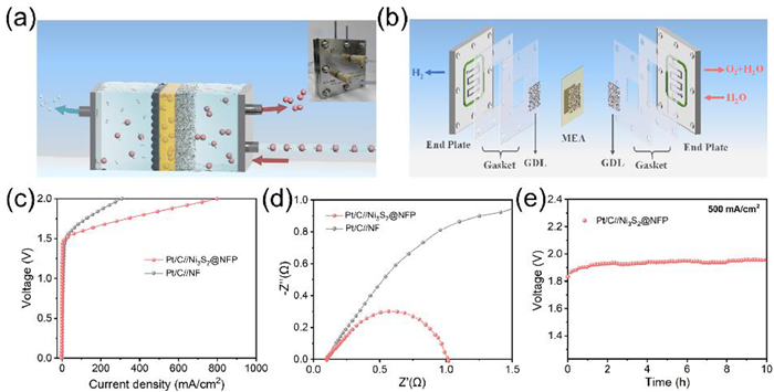 | Fig. 5. (a) The schematic diagram and optical picture of AEMWE device. (b) The assembly parts. (c) Polarization curves of Ni3S2@NFP-based AEMWE at 50 ℃ in 1.0 mol/L KOH. (d) Nyquist plots at 1.50 V. (e) Stability test at 500 mA/cm2. | |