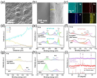We then conducted systematical characterizations to further explore the origin of high OER performance for Ni3S2@NFP. After OER, the morphology evolution (Fig. 3a and Fig. S15 in Supporting information), visibly intensified superficial Fe, P signals (Fig. S16 and Table S4 in Supporting information) and more even distribution of elements along the fracture surface (Figs. 3b-d) confirm element segregation and phase refusion between the double layer of Ni3S2@NFP. To this end, X-ray photoelectron spectroscopy (XPS) measurements were performed to analyze the chemical composition and elemental state of catalyst surface before and after chronopotentiometry test. The Ni 2p spectra (Fig. 3e) of Ni3S2@NFP after OER presents characteristic peaks at 873.3 eV (Ni 2p1/2) and 855.8 eV (Ni 2p3/2), along with two satellite peaks at 879.2 eV and 861.4 eV [23,31]. After peak deconvolution, the area ratio of Ni3+/Ni2+ is around 1.06, higher than that of Ni3S2 (0.48) before OER. Similarly, Fe 2p spectra (Fig. 3f) can be divided into two sub-peaks at 726.3 eV for Fe 2p1/2 and 712.7 eV for Fe 2p3/2 [32], displaying a higher area ratio of Fe3+/Fe2+ (2.19) than NFP (0.63). These indicate that the metal cations in Ni3S2@NFP are oxidized to higher valence states during in situ reconstruction and act as the real active sites for OER. Furthermore, compared with Ni 2p3/2, Fe 2p3/2 peak shows a preferential tendency towards higher binding energy after reaction, illustrating that the presence of iron site is conducive to the adsorption of reactant OH− and promoting the formation of *OO− intermediate, while nickel site may responsible for the subsequent O2 release [33,34], which is consistent with Tafel slope results. The XPS spectra of Ni3S2@NFP after chronopotentiometry test were also presented in Fig. S18 (Supporting information) for reference. As depicted in Fig. 3g, the original peak of M-P (where M stands for metal) disappears after reaction, implying most of P ions bonding with metal ions are oxidized to phosphate and transfer to the catalyst surface [31]. However, only partial S ions in M-S are oxidized to sulfate (Fig. 3h) and the remaining S may still exist as metal sulfides to inhibit the leaching of metal ions, due to their small solubility-product constants (Ksp) [17,18]. In parallel, according to the XRD pattern (Fig. 3i), the characteristic peaks of Ni3S2 disappear and Ni3S2@NFP becomes amorphous due to reconstruction after chronopotentiometry test [29,35].