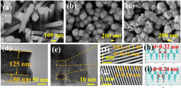 | Fig. 1. Top view SEM images of (a) TNRs, (b) MoS2/TNRs and (c) Ag NPs/MoS2/TNRs. (d, e) high-resolution TEM (HRTEM) images of Ag NPs/MoS2/TNRs. The enlarged area denoted in (e) corresponding to the HRTEM images of (f) TiO2 and (g) Ag, respectively. (h, i) Profile plots of the calibration for measuring the spacings of TiO2 and Ag. | |