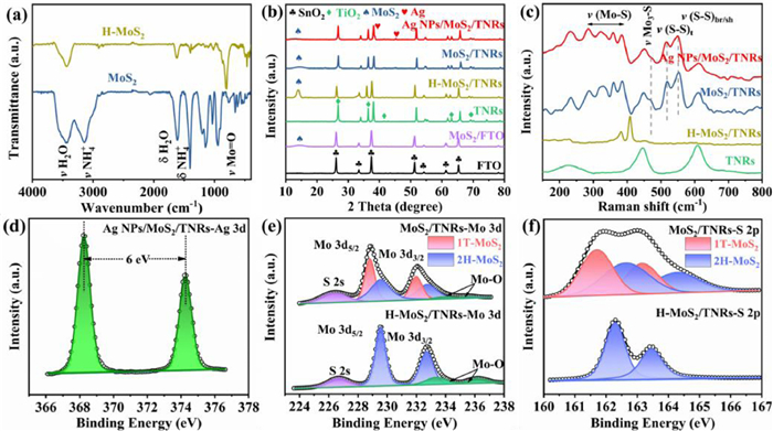 | Fig. 2. (a) FT-IR spectra of H-MoS2 and MoS2 samples. (b) XRD patterns and (c) Raman spectra of Ag NPs/MoS2/TNRs and each component. (d) The high-resolution XPS spectra of Ag 3d from Ag NPs/MoS2/TNRs. The high-resolution XPS spectra of (e) Mo 3d and (f) S 2p from MoS2/TNRs and H-MoS2/TNRs. | |