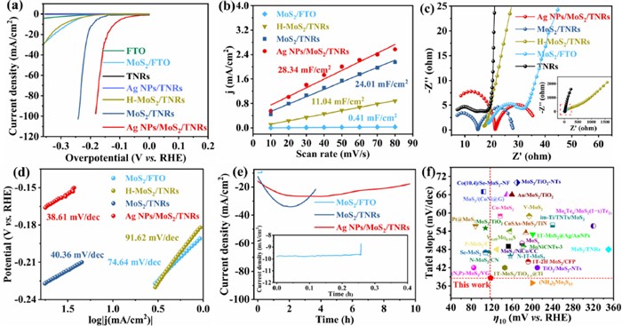 | Fig. 3. (a) Polarization curves of electroplating silver in 0.5 mol/L H2SO4 solution with a scan rate of 5 mV/s. Capacitive currents with (b) various sweeping velocities, (c) Nyquist plot and (d) tafel plots of the electrodes. (e) Constant voltage response of MoS2/FTO, MoS2/TNRs and Ag NPs/MoS2/TNRs. (f) Comparison Tafel slope and ƞ10 with other HER electrocatalysts reported recently. Values were plotted from references (Table S2 in Supporting information). | |