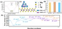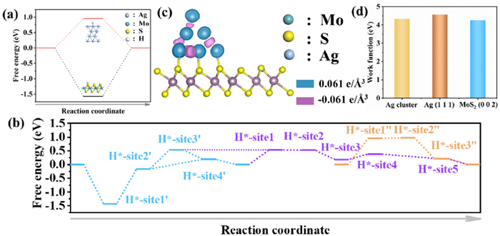 | Fig. 4. (a) Calculated free energy diagram for HER on MoS2 and Ag. (b) Free energies of HER on MoS2 and Ag were calculated for different hydrogen coverage and adsorption sites. (c) Electron density difference plot across the Ag-MoS2 interface. Electron accumulation and depletion are indicated in blue and purple, respectively. (d) Work function calculations for various Ag and MoS2. | |