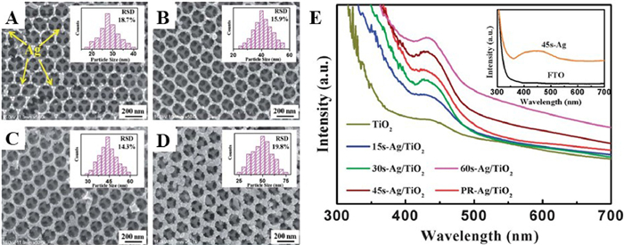 For example, the macroporous structure of OM TiO2 synthesized by Zhao and coauthors [63] and the plasmon resonance effect of deposited Ag nanoparticles synergistically modified TiO2 physically and chemically, which significantly enhancing visible light photocatalytic performance (Fig. S7 in Supporting information). Analogously, Chen and coauthors [64] used a pulse current deposition method to prepare OM TiO2 coated with highly dispersed Ag nanoparticles as plasma photocatalyst driven by visible light. Figs. 10A-D show that the size of the Ag nanoparticles gradually enlarges as the deposition time increases to 45 s while maintaining a high dispersion. In addition, no agglomerations of Ag nanoparticles were observed to block the pores of Ag/TiO2 samples. As shown in Fig. 10E, in contrast to the pure OM TiO2, all of Ag/TiO2 composites exhibit strong absorption in the range of 380–500 nm. The absorption intensity of the corresponding samples increased with the addition of deposition time. The excellent SPR properties of Ag nanoparticles and the homogeneous dispersion of Ag nanoparticles for photoexcited electrons make the compound material with good electron-hole separation efficiency and photocatalytic reduction of polluting gasses.