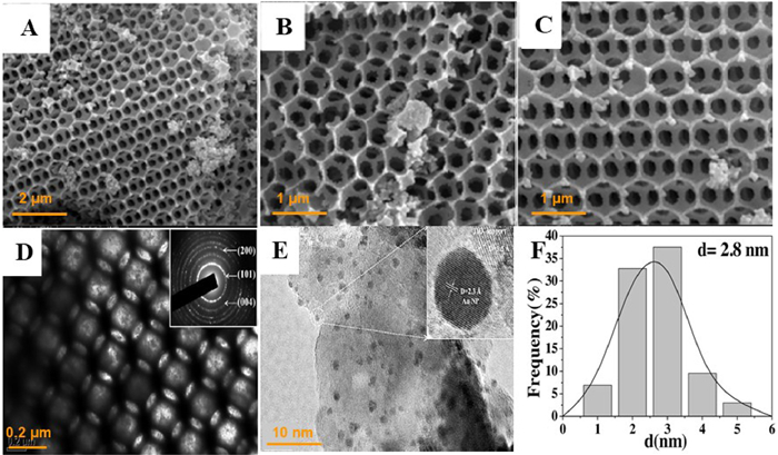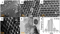 | Fig. 11. SEM images of (A) TiO2, (B) Au2/TiO2, and (C) Au4/TiO2. (D) TEM, (E) HRTEM and (F) Au nanoparticles size distribution of 3DOM Au4/TiO2. Reprinted with permission [65]. Copyright 2015, Elsevier. | |