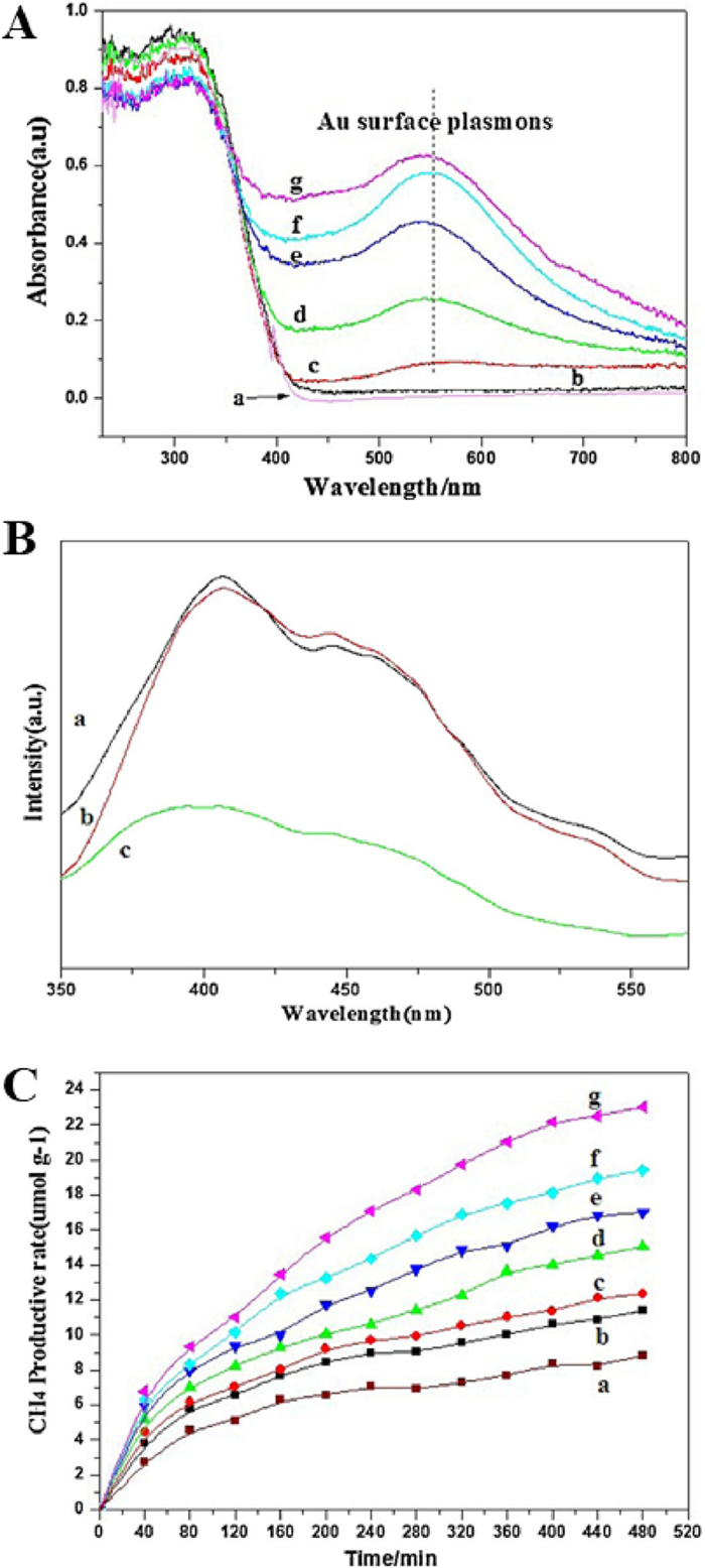 | Fig. 12. (A) Photoluminescence spectra. (B) Schematic illustration of the SPR effect for photocatalytic CO2 reduction on 3DOM Au/TiO2, (a) commercial-P25, (b) TiO2; (c) Au4/TiO2. (C) UV–vis DRS and (D) CH4 production. (A, C) (a) Commercial-P25, (b) TiO2, (c) Au0.5/TiO2, (d) Au1/TiO2, (e) Au2/TiO2, (f) Au4/TiO2, (g) Au8/TiO2. Reprinted with permission [65]. Copyright 2015, Elsevier. | |