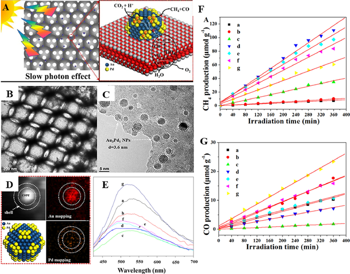 | Fig. 13. (A) The schematic for photocatalytic CO2 reduction with H2O to CH4, CO and O2 on AuPd/3DOM TiO2 catalyst. (B) TEM, (C) HRTEM images and (D) EDS elemental mapping images of Au3Pd1/3DOM-TiO2. (E) PL spectra. (F, G) Evolutions of CH4 and CO production for photocatalytic conversion of CO2 with H2O. (a) TiO2, (b) Au4/3DOM-TiO2, (c) Au3Pd1/3DOM-TiO2, (d) Au2Pd2/3DOM-TiO2, (e) Au1Pd3/3DOM-TiO2, (f) Pd4/3DOM-TiO2, (g) commercial-P25. Reprinted with permission [66]. Copyright 2017, Elsevier. | |
