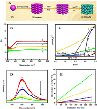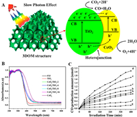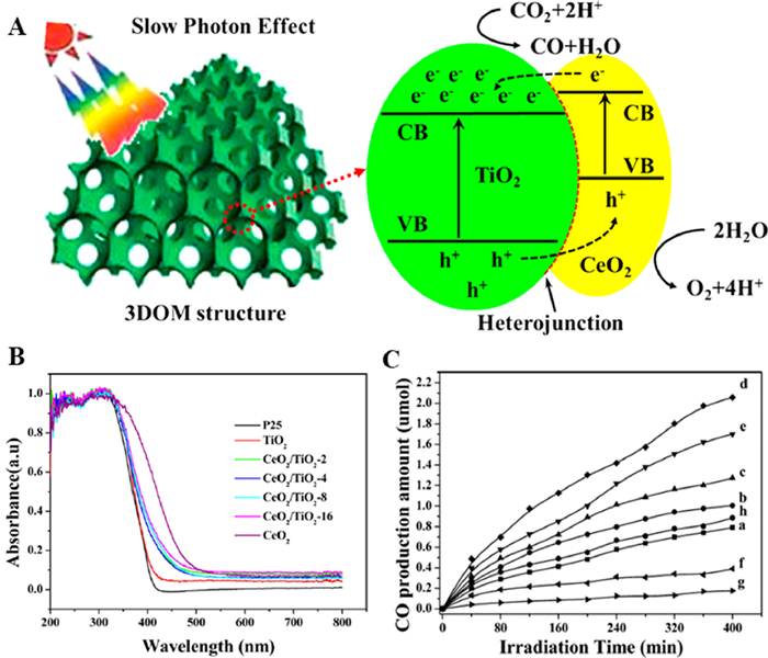 CeO2 has a narrow band gap (2.81 eV), which can absorb visible light [80]. Zhao and coauthors [81] successfully synthesized 3DOM CeO2/TiO2 heterojunction photocatalyst with different mass ratio and high photocatalytic performance for CO2 reduction (Fig. 15A). 3DOM TiO2 with large specific surface area provides a rich coupling interface for CeO2. The loading of semiconductor CeO2 extended the absorption edge of TiO2 at 380 nm to the visible light range (Fig. 15B), which improved the light utilization efficiency. The amount of CO produced by CO2 photocatalytic reduction under simulated light conditions is shown in Fig. 15C. It was found that 3DOM TiO2/CeO2–4 had the highest catalytic activity, produced the highest amount of CO (2.06 µmol). These results indicated that the synergistic effect of photonic crystal and the heterojunction between TiO2 and CeO2 enhance the photocatalytic performance.