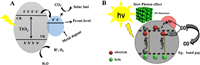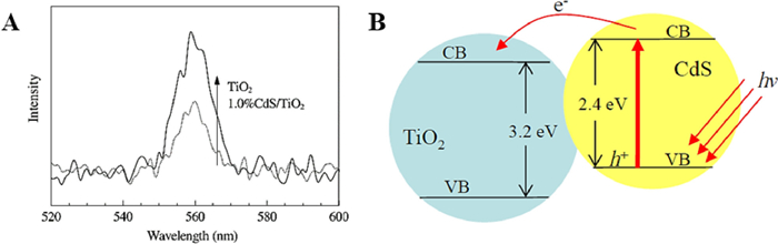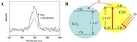 | Fig. 16. (A) PL spectra of TiO2 and 1.0% CdS/TiO2. (B) Electron transfer diagram of CdS/TiO2 films. Reprinted with permission [84]. Copyright 2013, Elsevier. | |