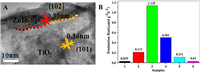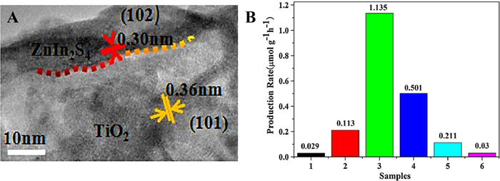 | Fig. 18. (A) HRTEM image of ZnIn2S4/TiO2. (B) CH4 generation velocity of (1) ZnIn2S4 nanosheets, (2) ZIS-0.25/TO, (3) ZIS-0.33/TO, (4) ZIS-0.50/TO, (5) ZIS-1/TO, and (6) TiO2 nanobelts. Reprinted with permission [91]. Copyright 2017, Elsevier. | |