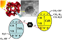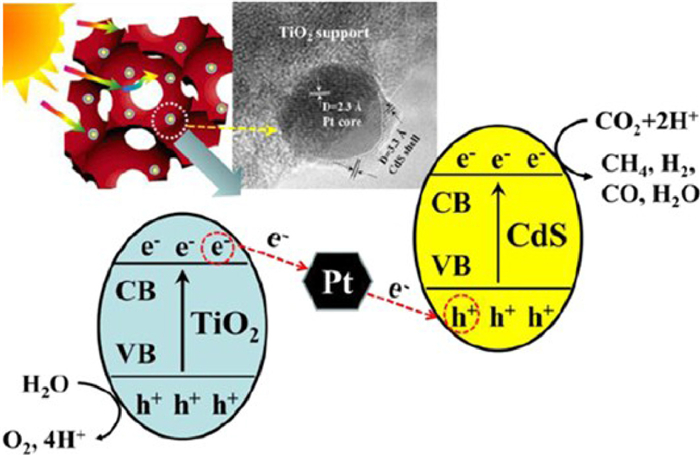 | Fig. 19. Schematic diagram for photocatalytic CO2 reduction of Pt@CdS/TiO2 Z-scheme heterojunction catalyst. Reprinted with permission [92]. Copyright 2015, Royal Society Chemistry. | |