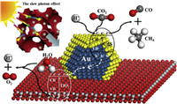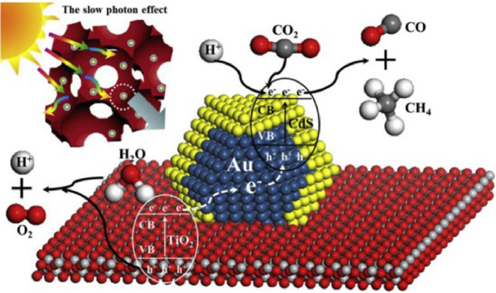 | Fig. 20. Schematic diagram for photocatalytic CO2 reduction of Au@CdS/IO-TiO2. Reprinted with permission [93]. Copyright 2015, Elsevier. | |