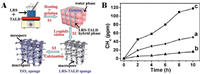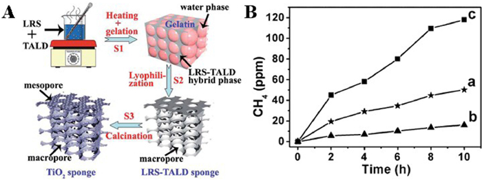 | Fig. 23. (A) Schematic diagram of the procedure for preparing specific TiO2 sponge. (B) CH4 generation of (a) macro-mesoporous TiO2 sponges, (b) referred TiO2 without LRS, and (c) Pt-Cu supported macro-mesoporous TiO2 sponges. Reprinted with permission [100]. Copyright 2014, Royal Society Chemistry. | |