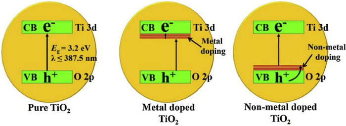 | Fig. 4. Schematic illustration for the comparison of band structure of the pure TiO2, metal doped TiO2 and non-metal doped TiO2. Reprinted with permission [37]. Copyright 2017, Elsevier. | |