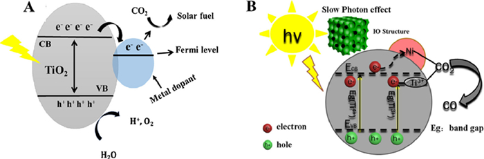 | Fig. 5. (A) Schematic of Metal doping. Reprinted with permission [43]. Copyright 2018, Elsevier. (B) Mechanism of photocatalytic CO2 reduction over IO-B-TiO2/Ni. Reprinted with permission [44]. Copyright 2019, Elsevier. | |