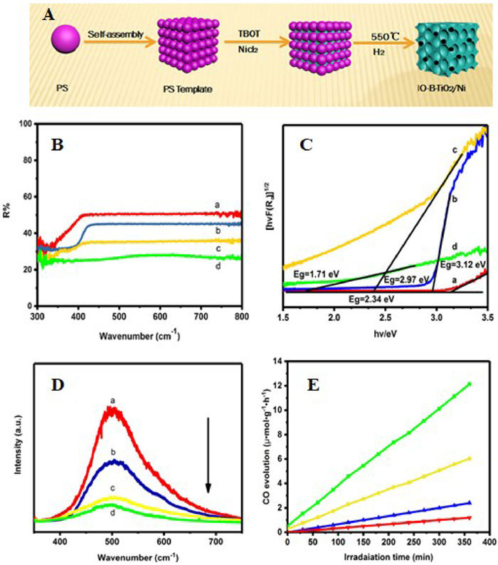 | Fig. 6. (A) Schematic diagram of IO-B-TiO2/Ni preparation. (B) UV–vis DRS. (C) the corresponding hv-[hvF (R∞)]1/2 curves. (D) PL spectra and (E) evolution of CO formation for photocatalytic CO2 reduction. (a) commercial-P25, (b) IO-W-TiO2, (c) IO-B-TiO2, (d) IO-B-TiO2/Ni. Reprinted with permission [44]. Copyright 2019, Elsevier. | |