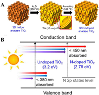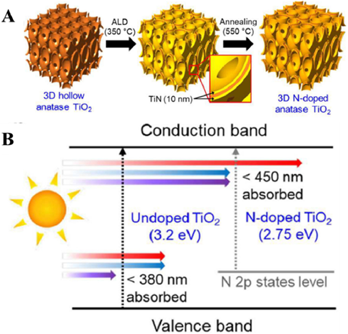 | Fig. 7. (A) flowchart of 3D N-doped TiO2 film production. (B) Comparison of band diagrams of undoped and N-doped TiO2 films. Reprinted with permission [54]. Copyright 2018, Royal Society of Chemistry. | |