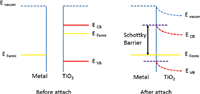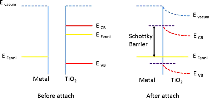 | Fig. 9. Formation of Schottky barrier between TiO2 and metal. Reprinted with permission [57]. Copyright 2015, Royal Society Chemistry. | |