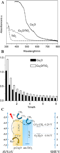 | Fig. 17. (A) UV–vis DRS of TiO2, Cu2O and Cu2O/TiO2. (B) CH4 formation rate of Cu2O and Cu2O/TiO2. (C) Schematic diagram for photocatalytic CO2 reduction over Cu2O/TiO2. Reprinted with permission [87]. Copyright 2015, Wiley Online Library. | |